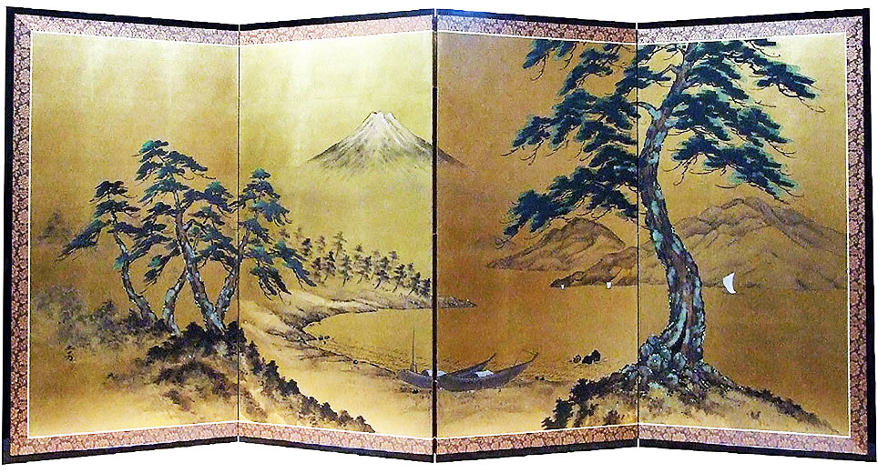 Plum blossoms are signals of Spring season started, following colorful cherry blossomes in town. Most of the mountain plum trees bloom white flowers with gentle scent, which attracts many birds. High moutains on top are covered with mist in spring and pine tree in the hill is a sybol of strongness. This paiting was made in gold leaf panels by artist Shunkoh in Kyoto.